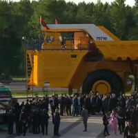Лукашенко лично провел для гостей небольшую экскурсию по экспозиции Минского международного выставочного центра. Центральный экспонат — карьерный самосвал «БелАЗ-75710», его грузоподъемность — 450 тонн.