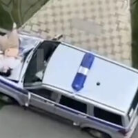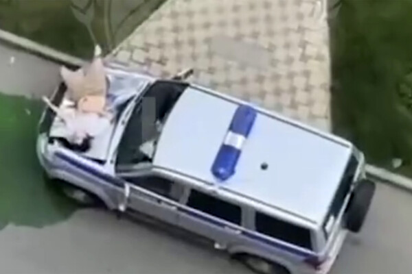 На опубликованных в сети кадрах видно, что человек лежит на капоте патрульного автомобиля.
