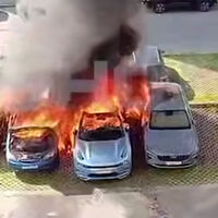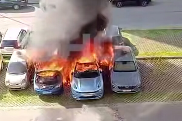 Прохожие запечатлели инцидент на камеру. На кадрах видно, как несколько автомобилей горят и взрываются на парковке.