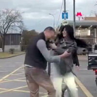 Очевидцы запечатлели инцидент на видео. На кадрах видно, как женщина бьет таксиста на проезжей части, при этом мужчина пытается защищаться.