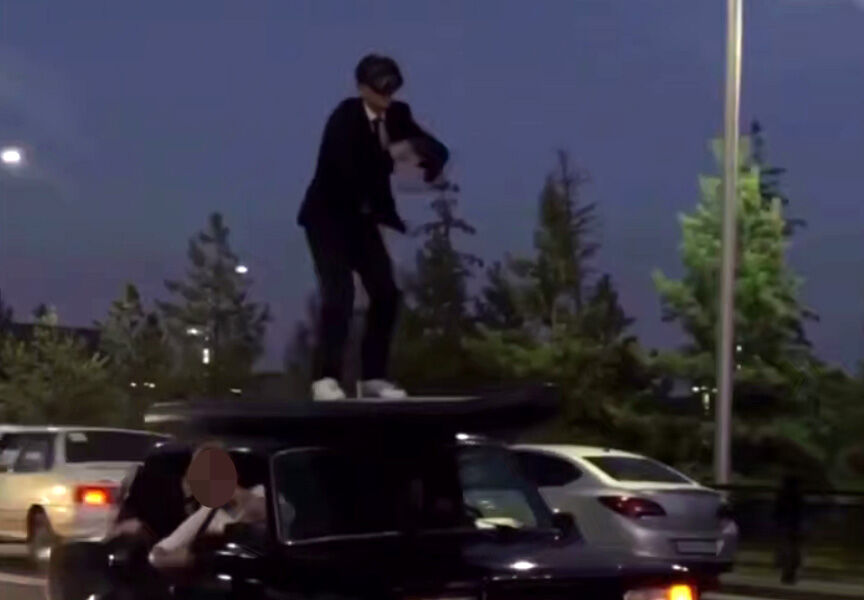 На опубликованных в сети кадрах видно, как мужчина стоит на крыше черного автомобиля, который едет по проезжей части. На записи также заметно, что нарушитель танцует.
