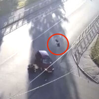 Уличная камера запечатлела инцидент. На кадрах видно, как курьер врезается в красный автомобиль. От удара мужчина подлетает в воздух, переворачивается, врезается в железное ограждение и падает на землю.