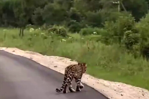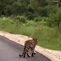 Очевидцы запечатлели инцидент на видео. На кадрах видно, как леопард идет по проезжей части, после чего уходит на обочину дороги.