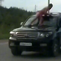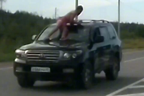 Видеорегистратор автомобиля, водитель которого стал очевидцем произошедшего, запечатлел инцидент. На кадрах видно, как человек стоит на капоте автомобиля, который едет по проезжей части, и держится за крышу.