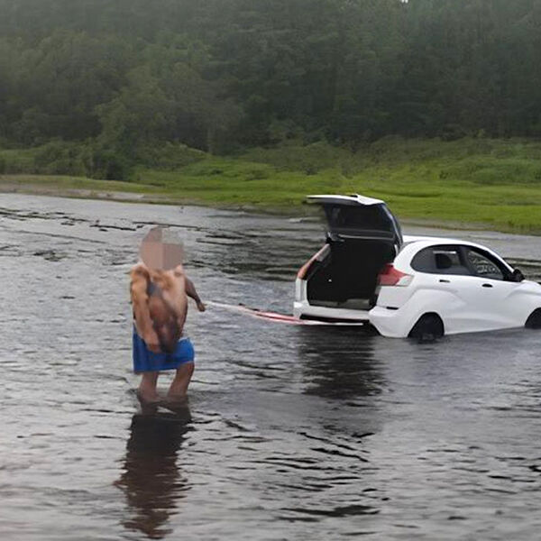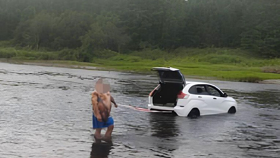 На опубликованных в сети кадрах видно, что белый автомобиль стоит в воде, при этом к транспорту привязан трос.