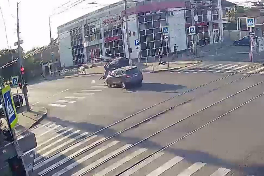 Уличная камера запечатлела инцидент. На кадрах видно, как внедорожник сбивает велосипедиста на пешеходном переходе. От удара мужчина перелетает через капот и приземляется на проезжую часть.