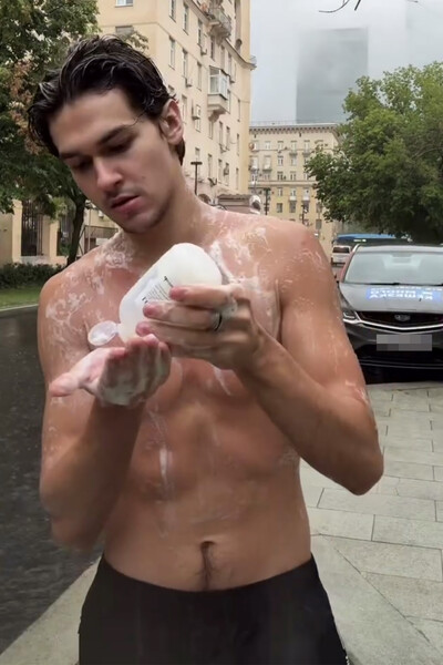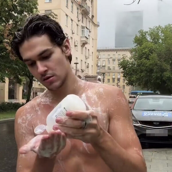 На опубликованных в сети кадрах видно, как мужчина в одном полотенце стоит возле дороги. Москвич наливает гель для душа на мочалку, мылится и моет голову водой из лужи на проезжей части. Далее на записи видно, как мужчина чистит зубы.