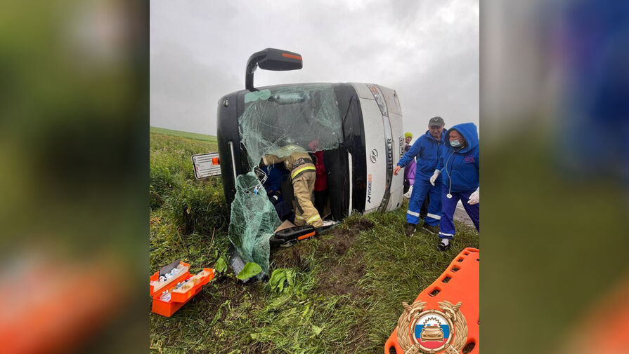 По информации канала, в момент ДТП в салоне находились 40 человек. На опубликованных в сети кадрах видно, что автобус вылетел с дороги и упал на бок. Транспорт получил повреждения: смят кузов и разбито лобовое стекло.