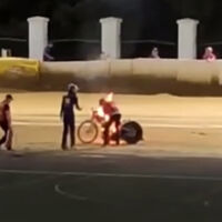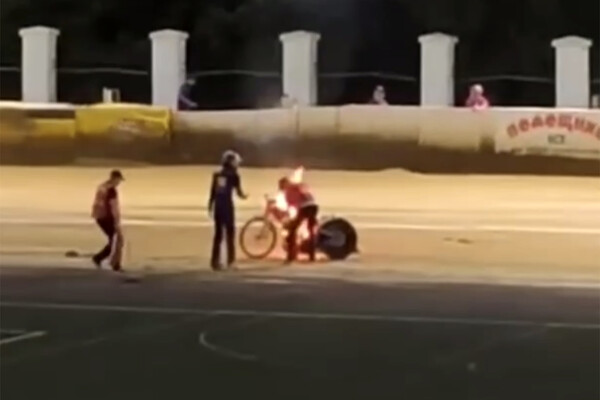 «Мотоцикл гонщика команды «Восток» вспыхнул в разгар соревнований. На кадрах видно, как судьи собственными силами тушат загоревшегося железного коня» — говорится в сообщении.