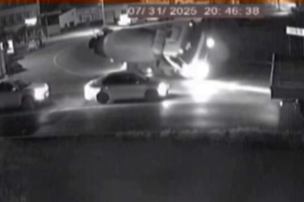 Уличная камера запечатлела инцидент. На кадрах видно, как на повороте бетономешалка падает на проезжую часть и влетает в два остановившихся автомобиля. От удара машины разлетаются в разные стороны.