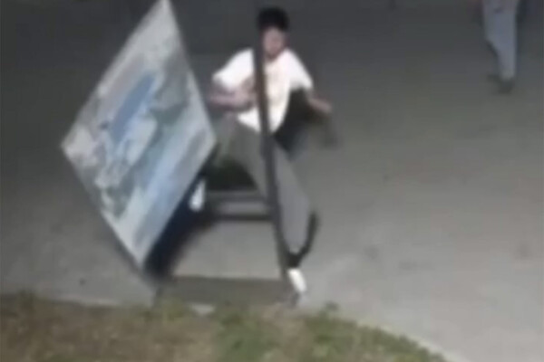 Уличная камера запечатлела инцидент. На кадрах видно, как человек выбивает дорожный знак, после чего вместе с другим владивостокцем ломают деревья, забирают знак и уходят с двумя девушками.