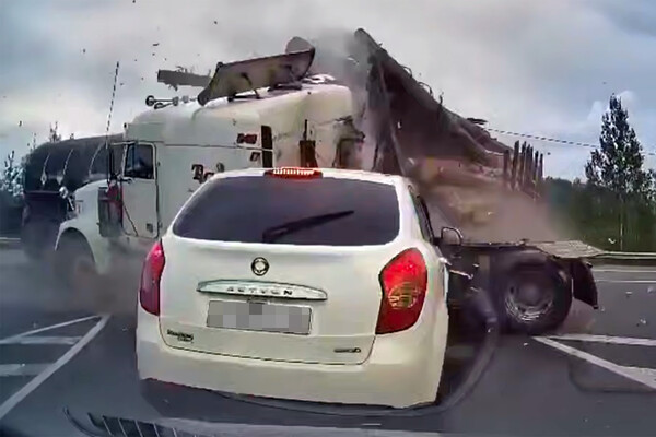 «На кадрах видно, как на перекрестке фура с цистерной с битумом врезается в лесовоз и задевает легковушку, которую отбрасывает в стоящую позади машину. После из автомобиля выходят шокированные водитель и пассажирка», — говорится в публикации.
