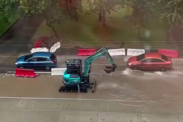 Очевидцы запечатлели инцидент на видео. На кадрах видно, как экскаватор, стоящий на затопленной проезжей части, набирает в ковш воду и сразу же выливает ее обратно на дорогу. То же самое техника повторяет еще раз.