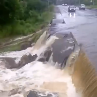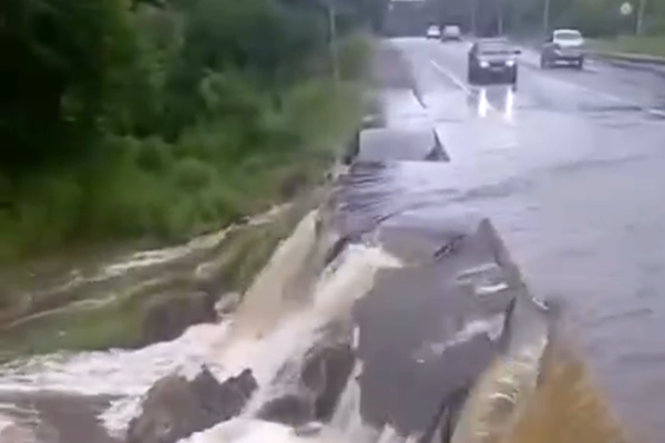 На кадрах видно, что сильный поток воды движется поперек проезжей части, при этом у обочины на дороге размыло асфальт и грунт, образовался небольшой водопад. По уцелевшей части дороги на небольшой скорости проезжают легковые автомобили.