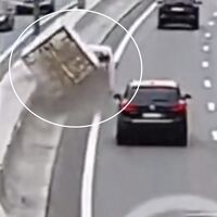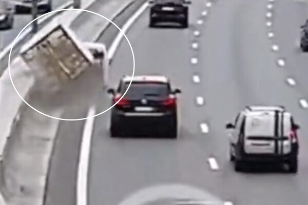 Уличная камера запечатлела инцидент. На кадрах видно, как грузовик врезается сначала в дорожное ограждение, после чего – в столб. От сильного удара у транспорта отлетает кузов, а груз и автомобильные детали разлетаются по проезжей части.