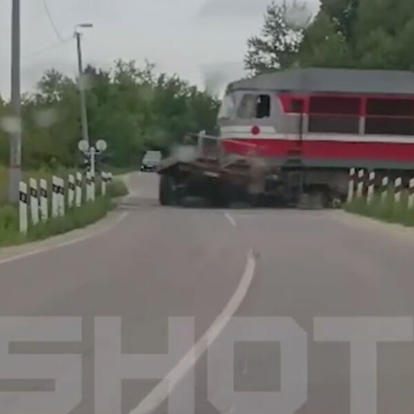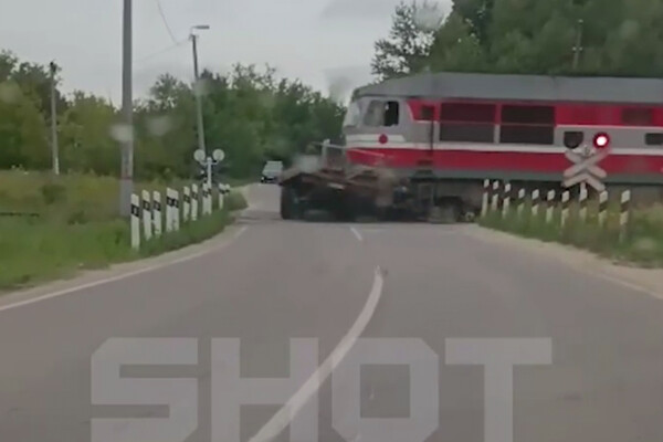 Очевидец запечатлел инцидент на видео. На кадрах заметно, как состав сносит грузовик, остановившийся на рельсах.