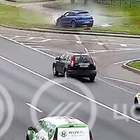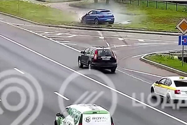 Уличная камера запечатлела инцидент. На кадрах видно, как синий автомобиль врезается в белую легковую машину, водитель которой собирается повернуть. От удара автомобили разлетаются в разные стороны, при этом синяя машина сбивает знак и выезжает с проезжей части, а легковой автомобиль двигается через несколько полос и останавливается.