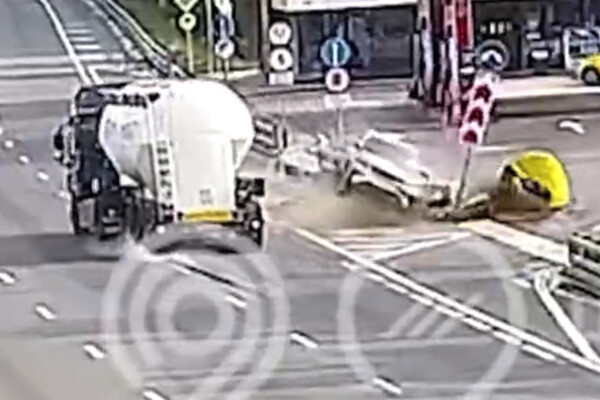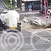 Уличная камера запечатлела инцидент. На кадрах видно, как машина поворачивает на заправочную станцую, и в этот момент в нее врезается проезжающая цистерна. От удара автомобиль отбрасывает в дорожное ограждение, а также транспорт сносит знак. На записи заметно, как в момент столкновения автомобильные детали разлетаются по проезжей части.