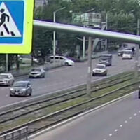 На записи видно, как автомобиль сбивает мотоциклиста, который едет в потоке машин. От удара байкер подлетает в воздух, переворачивается и приземляется на проезжую часть. Кроме того, в момент столкновения автомобиль разворачивает в другую сторону.