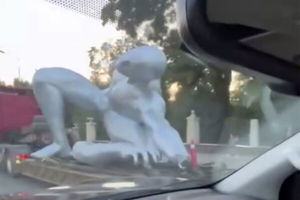 На опубликованных в сети кадрах видно, что большую серую статую обнаженного мужчины перевозят на красном грузовике. На кадрах также заметно, что рядом проезжает много автомобилей.