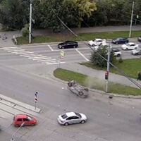 Уличная камера запечатлела инцидент. На кадрах видно, как после столкновения иномарка врезается в столб, переворачивается и несколько раз прокручивается на крыше.