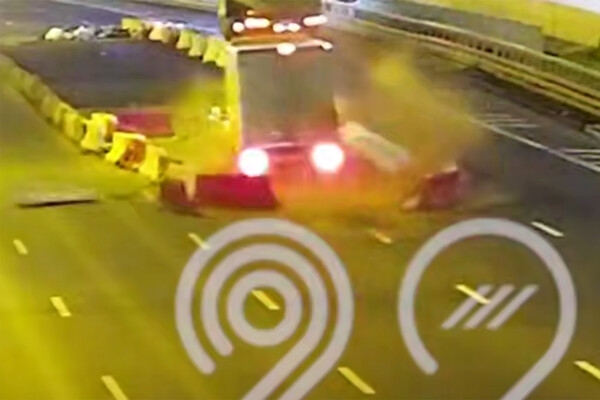 Уличная камера запечатлела инцидент. На кадрах видно, как грузовик на большой скорости врезается в дорожные ограждения и знаки, после чего останавливается.