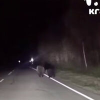 Очевидцы запечатлели хищников на видео. На кадрах видно, как три медведя бегут по проезжей части, при этом их не пугает свет фар.