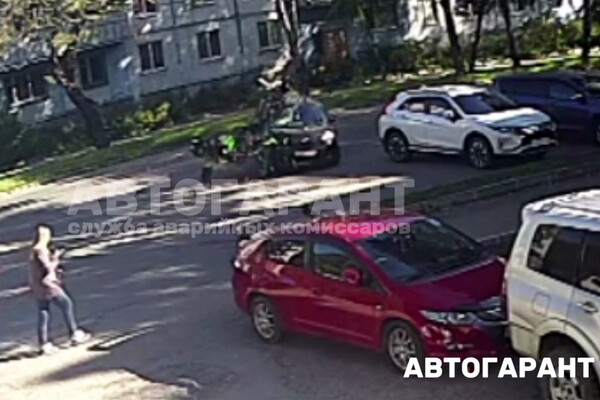 «Рулевой Toyota bB, поворачивая налево, не пропустила мотоцикл Kawasaki. После bB ударил припаркованный Mitsubishi Eclipse Cross. От сильного удара водитель мотоцикла перелетел через машину», — говорится в сообщении.