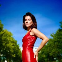 На фотографиях видно, что актриса стоит в обтягивающем красном кожаном платье на проезжей части. Кроме того, на кадрах заметно, что она положила руку на ягодицы.