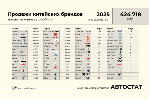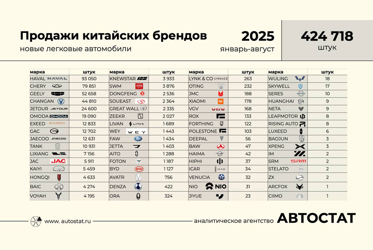 В России с января по август 2025 года на учет встало 424,7 тыс. новых легковых автомобилей 64-х китайских брендов. Об этом сообщает директор «Автостата» Сергей Целиков в своем Telegram-канале.