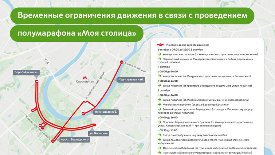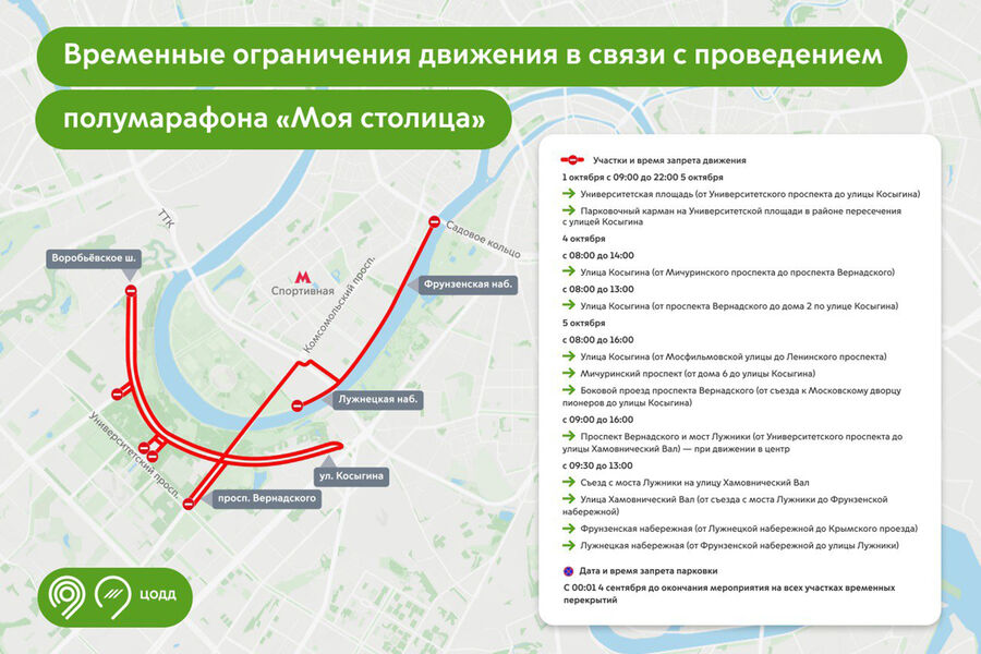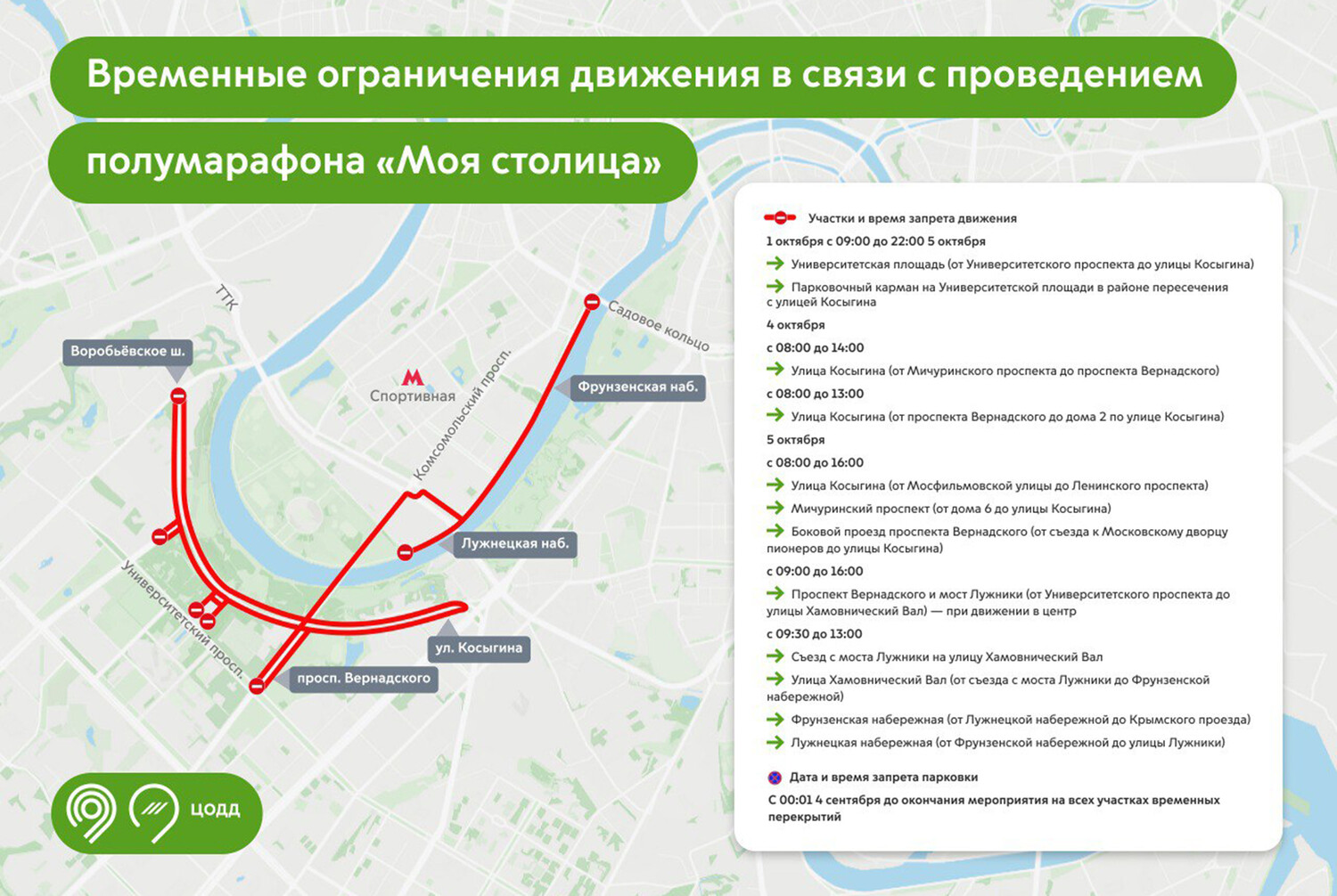 «Движение перекроют: с 09:00 1 октября до 22:00 5 октября на Университетской площади. 4 октября с 08:00 до 16:00 на улице Косыгина и Мичуринском проспекте. 5 октября с 09:00 до 16:00 на проспекте Вернадского и мосту Лужники», — говорится в публикации.