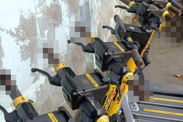 На опубликованных в сети кадрах видно, что ручки у восьми электросамокатов обмазаны фекалиями.