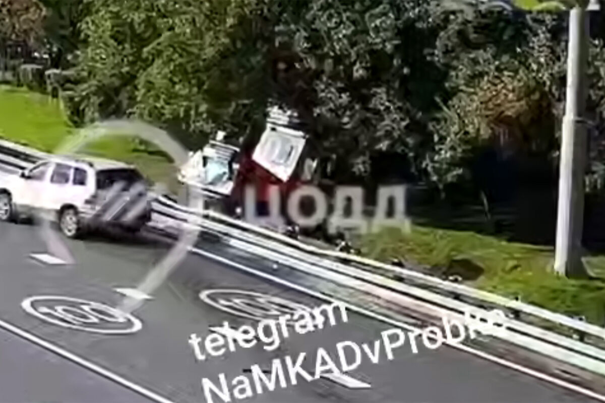 В Москве на МКАД фронтальный погрузчик перелетел через дорожное ограждение в момент ДТП. Об этом сообщает Telegram-канал «На МКАДе ДТП Москва».
