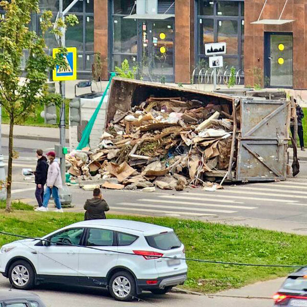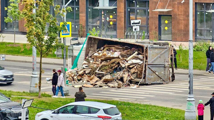 На юго-западе Москвы посреди дороги опрокинулся самосвал с мусором