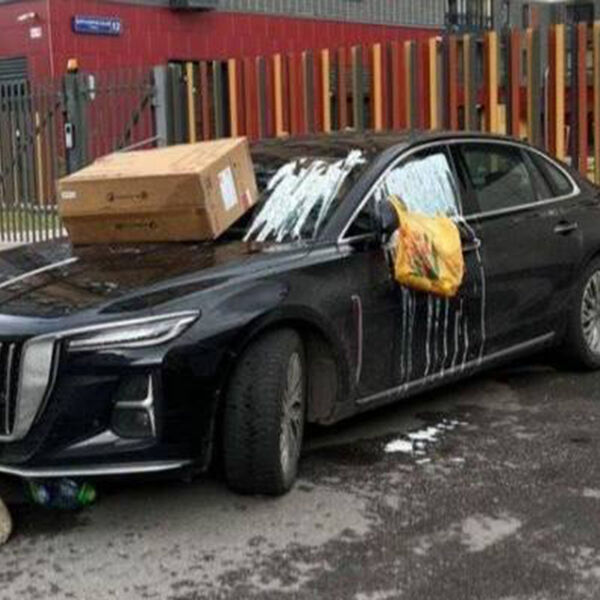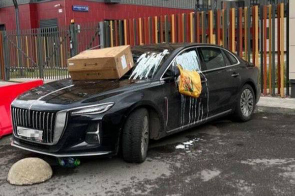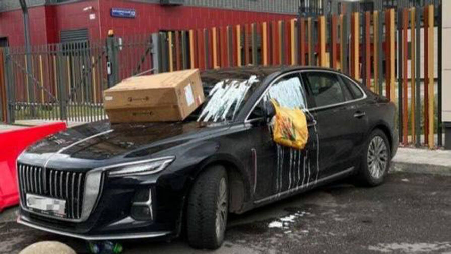 На опубликованных в сети кадрах видно, что на припаркованной иномарке лежит мусор: на капоте – коробка, к фарам привязан пакет, а также нарушители облили транспорт белой жидкостью.