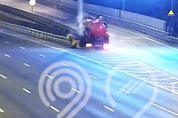Авария на 76-м километре МКАД произошла 30 августа. На кадрах с камер видеонаблюдения видно, что водитель автоцистерны включил правый поворот и начал съезжать на развязку, однако не завершил маневр. Грузовик врезался в отбойник, проскользил вдоль столба и опрокинулся на проезжую часть.