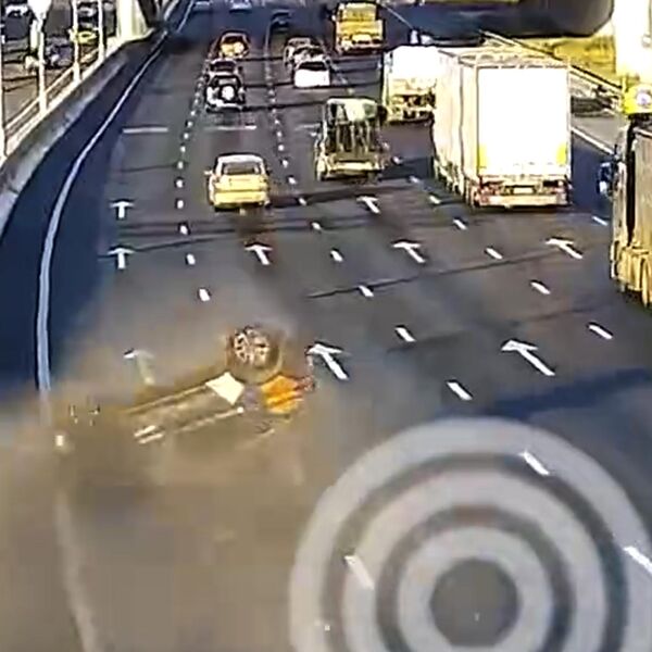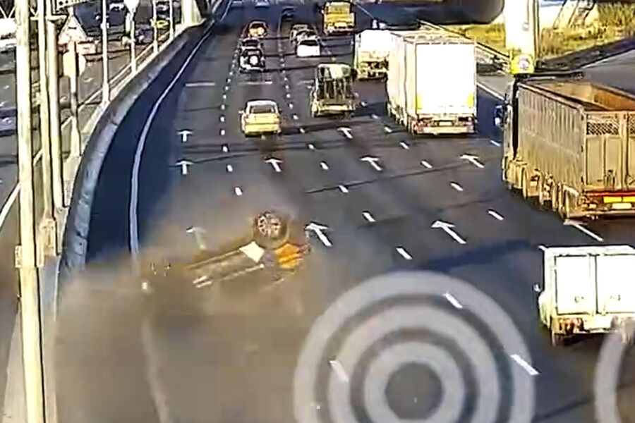 На МКАД водитель каршерингового автомобиля врезался в отбойник, а затем дважды перевернулся и попал под небольшой грузовик. Видеозапись инцидента опубликовал Telegram-канал «СпецДорПроект».