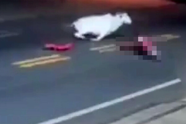 Уличная камера запечатлела инцидент. На кадрах видно, как мотоцикл на большой скорости врезается в животное, которое идет по проезжей части, и отлетает в сторону. После произошедшего корова пытается встать.