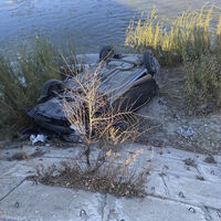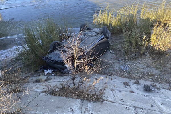На кадрах с места происшествия видно, что автомобиль лежит на берегу реки рядом с отмосткой, укрепляющей опору моста. В непосредственной близости от опрокинутой машины виден поток воды.