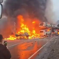 На опубликованных в сети кадрах видно, что пламя охватило машины полностью. По информации канала, в результате произошедшего водитель одного из грузовиков получил травмы, несовместимые с жизнью. На месте ДТП работали сотрудники экстренных служб. Кроме того, после аварии инспекторы ДПС ограничивали движение транспорта в обоих направлениях.