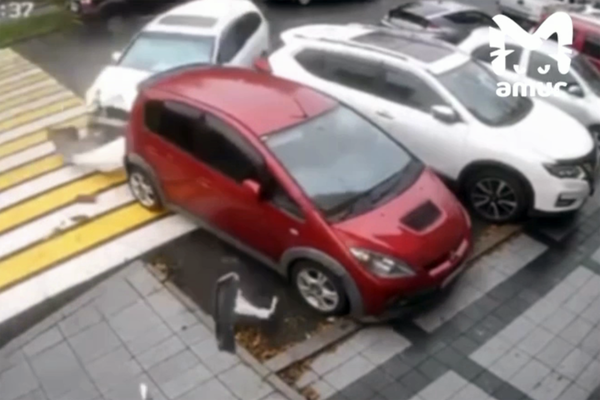 Уличная камера запечатлела инцидент. На кадрах видно, как белая иномарка на скорости врезается в припаркованные автомобили, от удара ее отбрасывает в сторону, а автомобильные детали разлетаются по проезжей части.