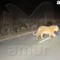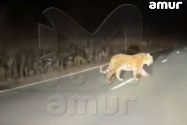 На опубликованных в сети кадрах видно, как тигр идет впереди автомобиля, при этом ходит как по проезжей части, так и по обочини дороге, после чего убегает в лес.