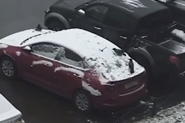 Местные жители запечатлели происходящее на видео. На кадрах заметно, как птицы на лапах съезжают по заснеженным стеклам припаркованного красного автомобиля.