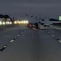 На кадрах с видеорегистратора автомобиля, водитель которого стал очевидцем произошедшего, видно, как самолет приземляется на машину, которая едет по проезжей части. От удара автомобильные детали разлетаются по дороге, а воздушное судно начинает искриться.