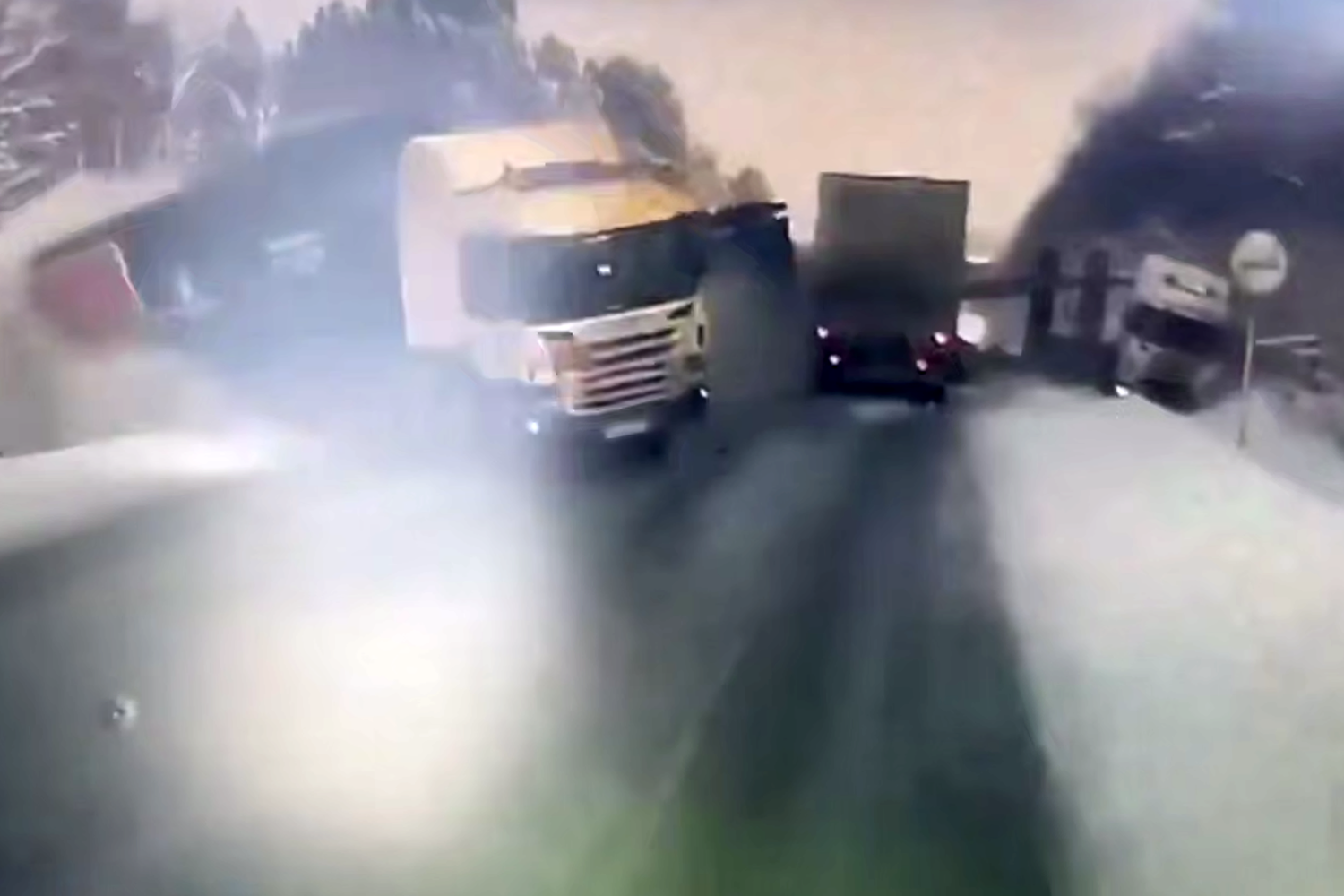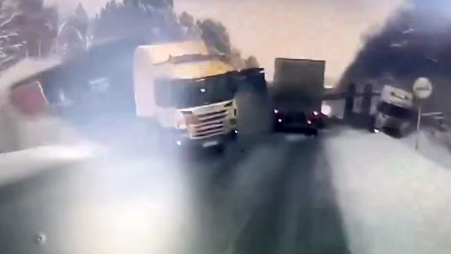 Видеорегистратор автомобиля, водитель которого стал очевидцем произошедшего, запечатлел инцидент. На кадрах видно, как одна из фур съезжает на обочину, в этот момент в нее врезается второй большегруз, который движется во встречной направлении, и фура, которая едет – в попутном.