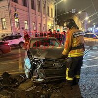 На кадрах с места происшествия видно, что у седана Audi разбита передняя часть. На месте происшествия работают пожарные и скорая помощь.