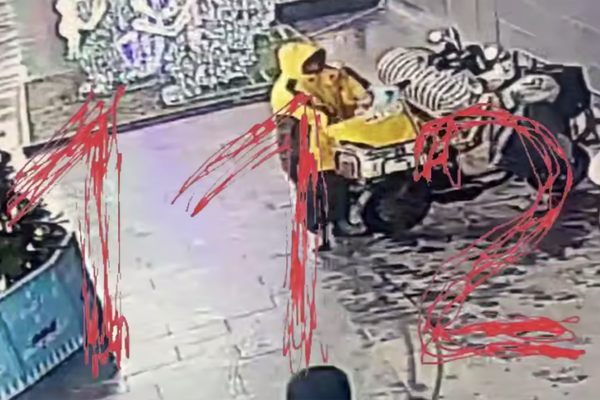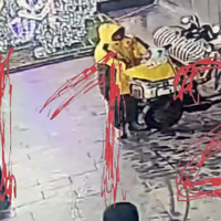 Уличная камера запечатлела инцидент. На кадрах видно, как два курьера останавливают мопеды и из сумок достают детей, при этом рядом стоят люди, которые не реагируют на произошедшее.