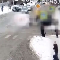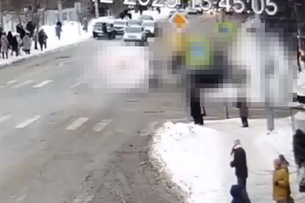 Уличная камера запечатлела инцидент. На кадрах видно, как после столкновения один из автомобилей вылетает с проезжей части и сбивает пешеходов, при этом в момент удара человек отлетает в сторону.