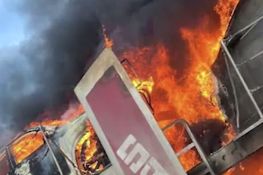 Очевидцы запечатлели инцидент на видео. На кадрах видно, как автовоз горит на проезжей части, при этом пламя охватило транспорт полностью. Также заметно, что возле вспыхнувшего автомобиля ходят люди. О состоянии водителя не сообщается.