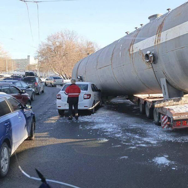 Видео: в Уфе гигантская цистерна раздавила легковушку на дороге